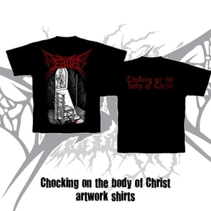 Black shirt with red logo and white artwork on front / "choking on the body of Christ" in red on back